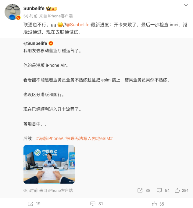 据了解,业务员业务不熟练,没区分港版和国行,可顺利进入开卡流程了。不过遗憾的是,该用户开卡失败,最后一步检查IMEI,港版iPhone Air没通过。随后,该用户又去联通试了试,结果同样不行。